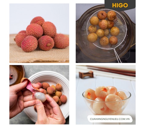 Chuẩn bị một nồi nước sôi để luộc sơ trái vải khoảng 2 -3 phút rồi vớt ra ngâm vào 1 thau nước đá để trái vải săn lại, vải vừa nguội thì vớt ra lột vỏ, tách hột