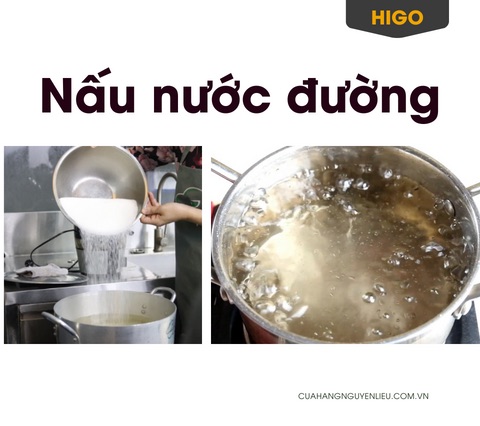 Hoà tan 500 gram đường cát vào 900ml nước lọc rồi đun sôi trên lửa nhỏ đến khi đường tan và sôi lên. Canh đun liu riu thêm 5 phút nữa trên lửa nhỏ rồi tắt bếp, để nguội.